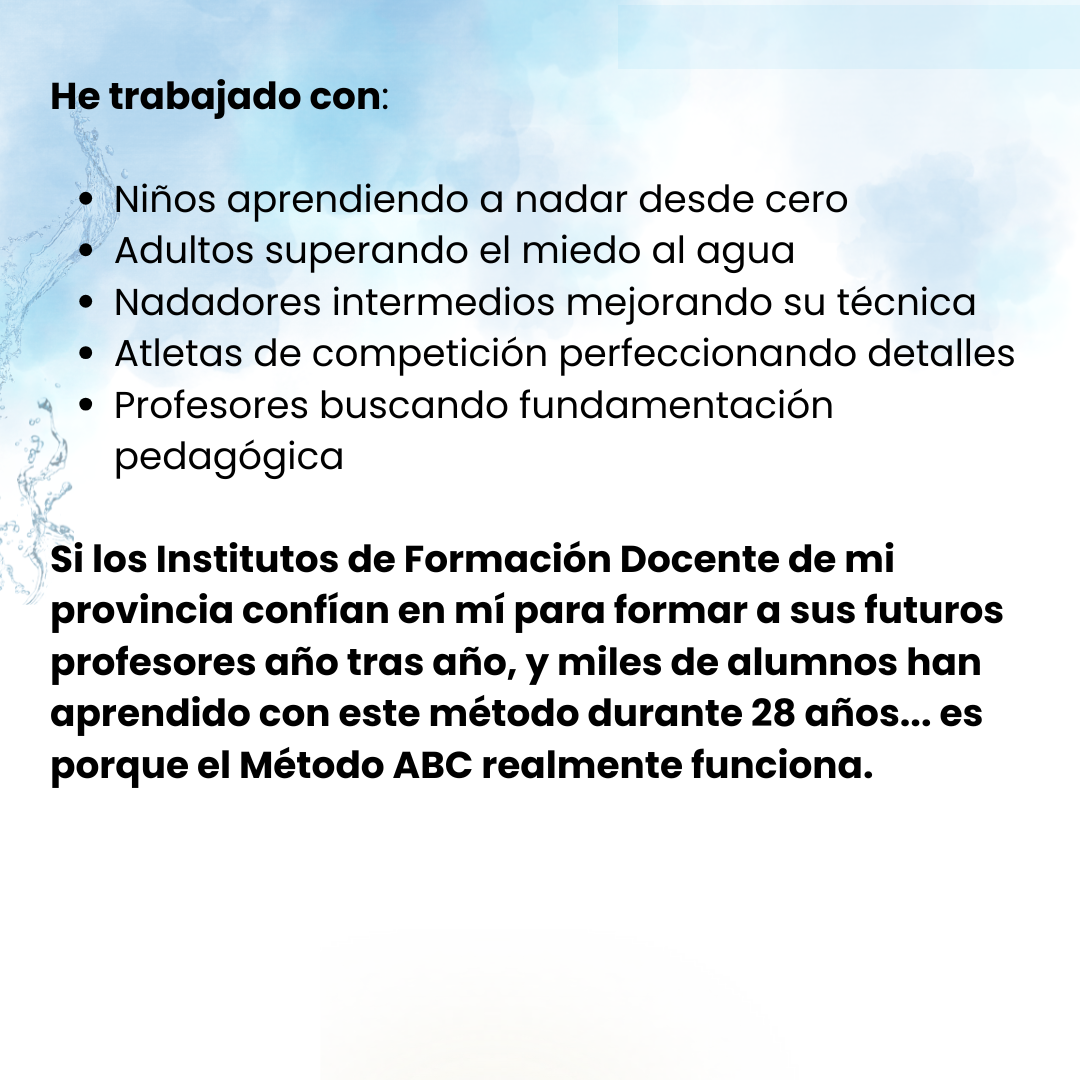 Llevo 28 años enseñando natación (desde 1997) y 15+ años formando profesores.